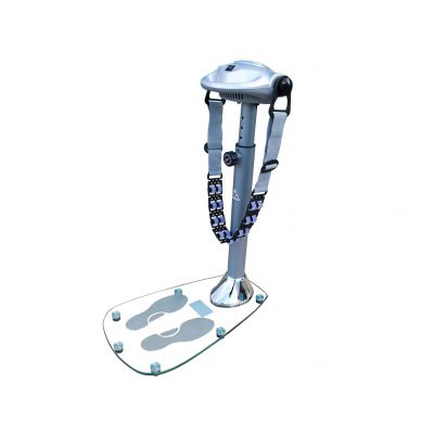 Ленточный напольный вибромассажёр VM10 для домашнего использования. В основании тренажёра — гальваническая труба 76 мм в диаметре, с толщиной стенок 1,5 мм. На платформе из закалённого стекла нанесён рисунок для правильной постановки ног во время сеанса.